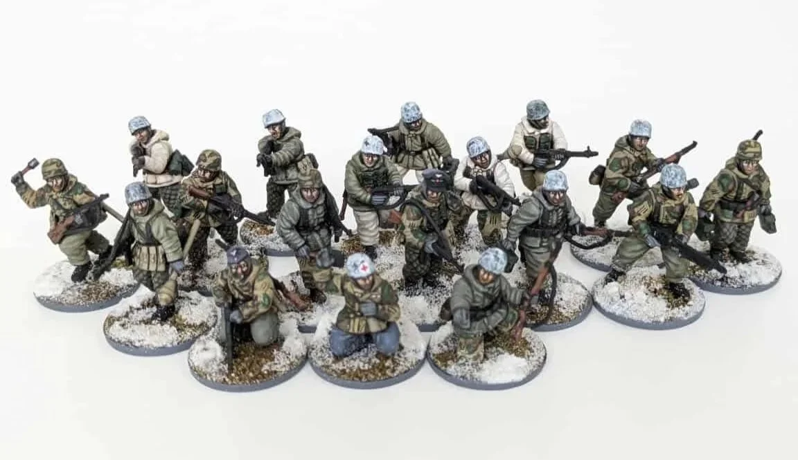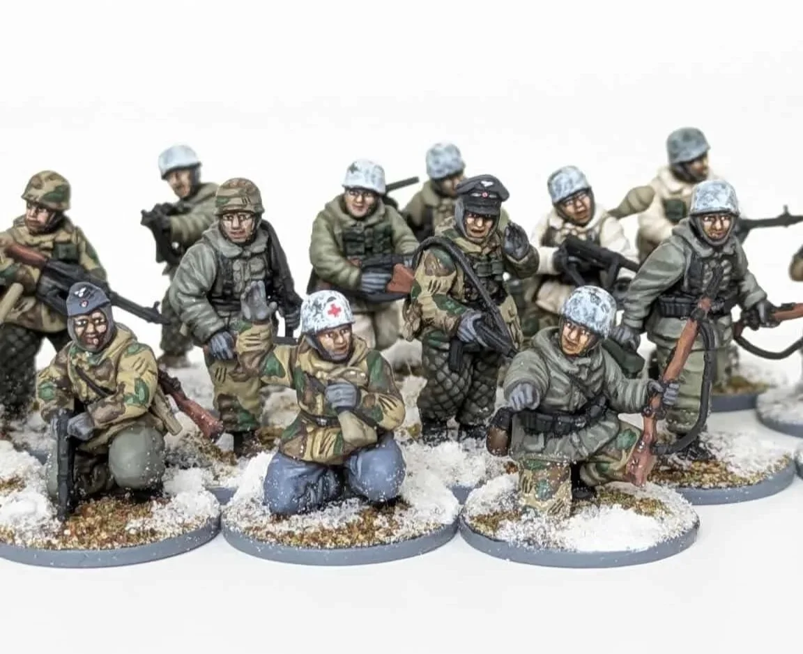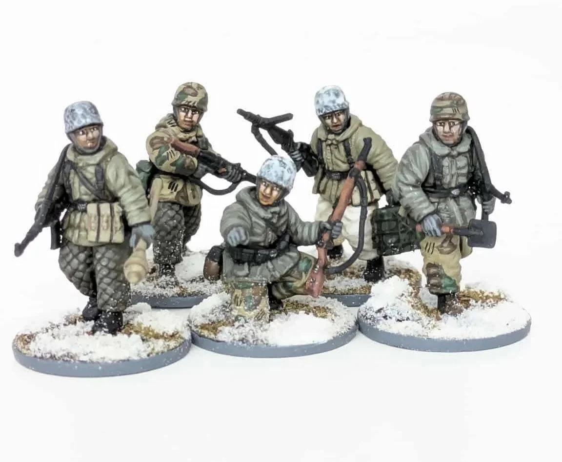 I did the Fallschirmjager first as I deliberately did not want a uniform looking force and I wanted a grizzly veteran look to them with no two figures being the same. I used a variety of uniform combinations mixed with different poses and weaponry. They are probably not historically accurate but I think mine look far better and are more representative of the Ardennes Campaign than the box art. All too often hobbyists follow the box art, I am guilty of this but this time around there was no way my Fallschirmjager were going to be painted mostly white.