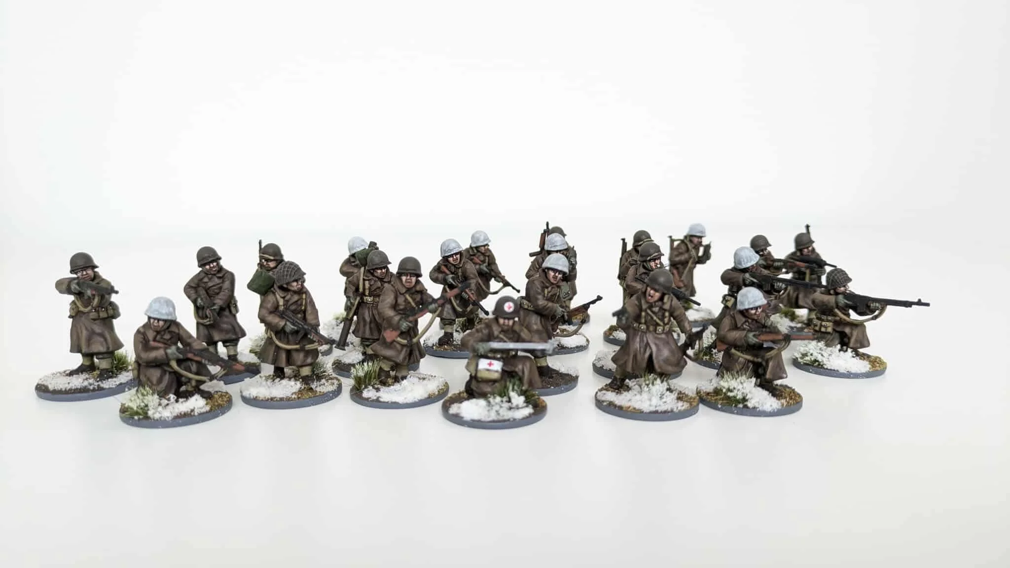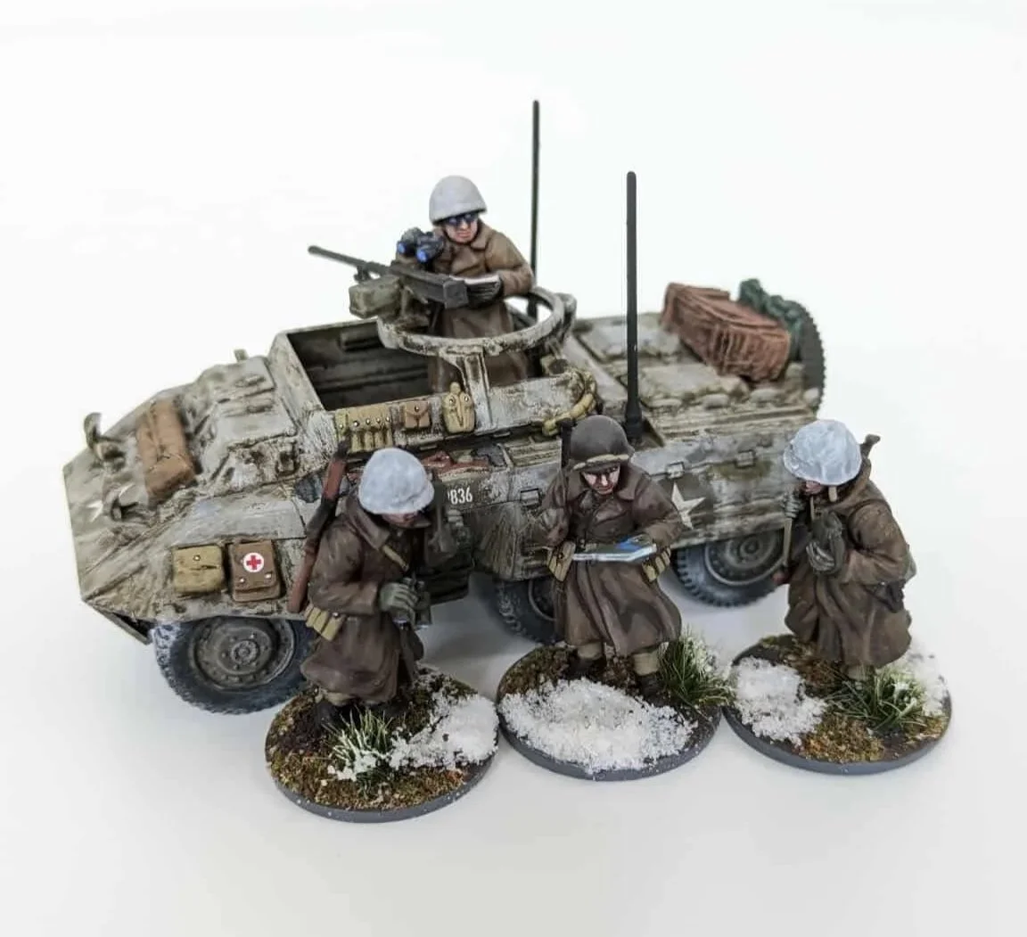 I already have a M8 Greyhound for a vehicle so I decided to build the less seen M20 variant. I decided to add a miniature from the included US infantry as a crewman. This adds character to the vehicle and makes it more fun to paint. I always planned to paint the US Infantry uniformed as this is accurate to the period and made the “assembly line” painting technique come in handy to get without a doubt the most monotonous and visually repetitive part of the project done.