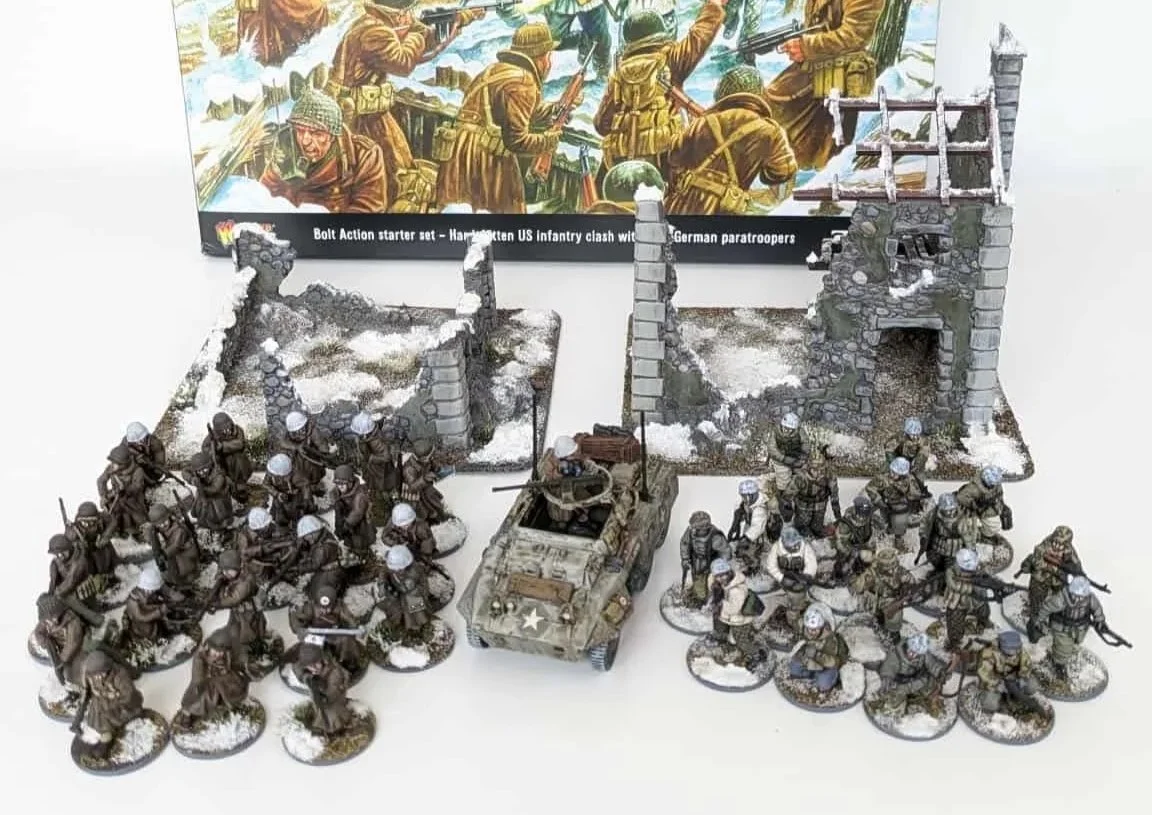 This is the Bolt Action Third Edition Starter box by Warlord Games. There are 24 US Army Infantry, 18 German Fallschirmjager Paratroopers, a US M20 Scout Car and a Ruined Farm House for terrain. All up there is 42 painted miniatures, a nice vehicle and a little bit of terrain to add to the table.