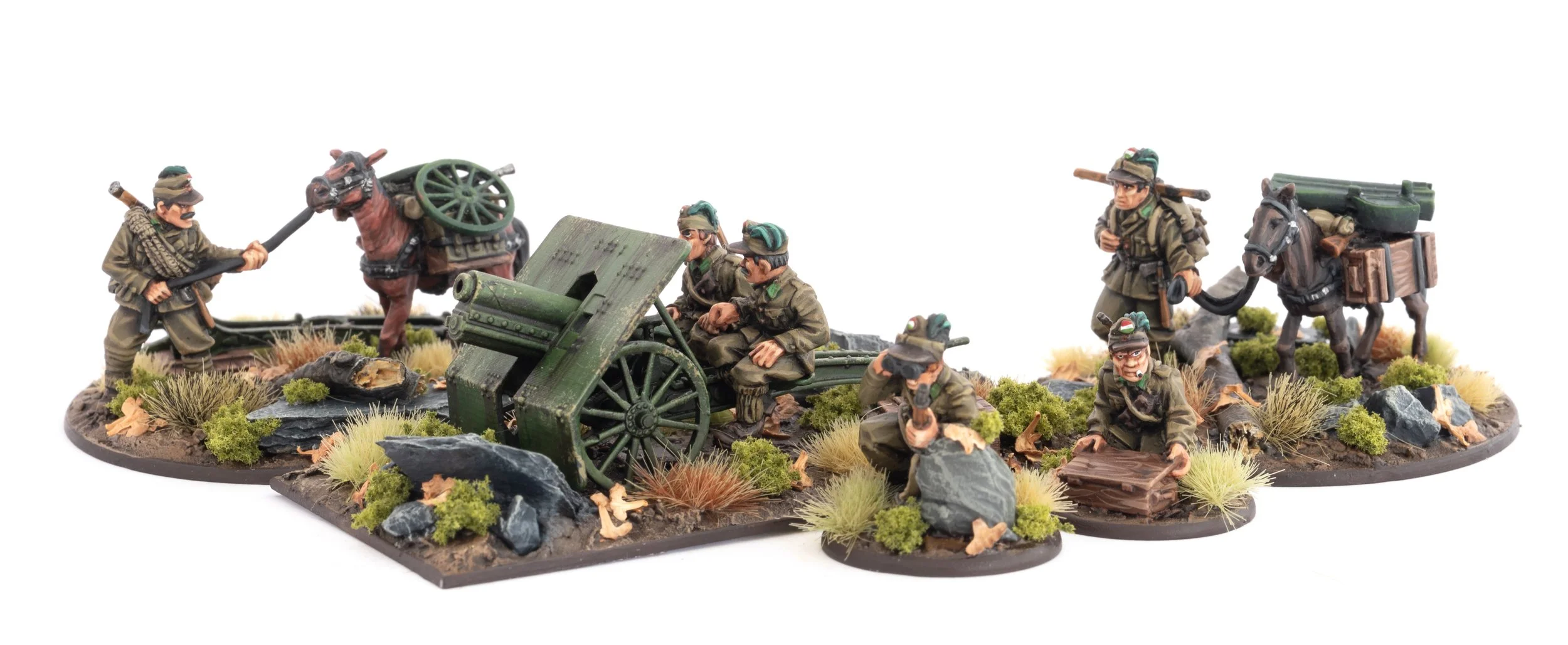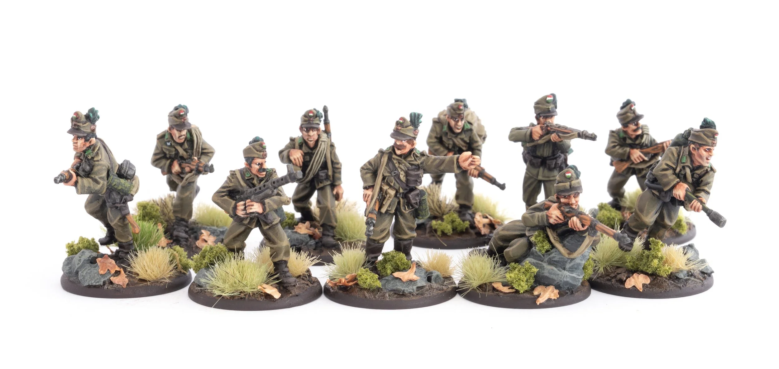 The basic infantry squads are all Border Guards and Mountain Division from the Bolt Action Hungarian range. To convert up the AT guns and weapon teams I converted Italian Alpini miniatures, mostly with just head swaps, taking plastic German heads with peaked caps and adding a mustache and feathered plume.